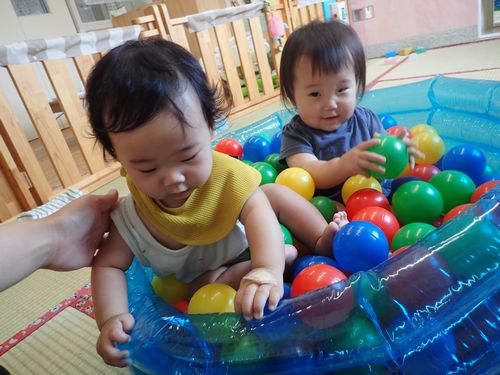保育室にビニールプールを出してボールプールをしたり、