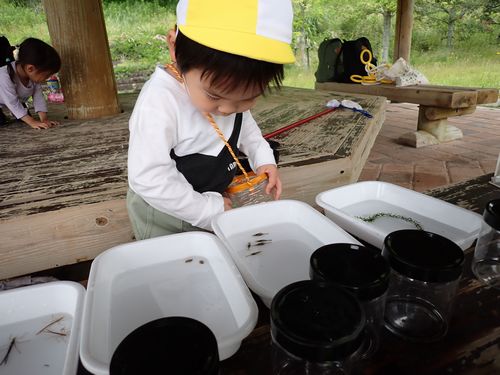 水辺の生き物を観察しています。