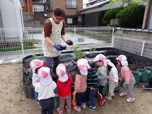 プランターに入れた苗に土のお布団をかけてあげます。