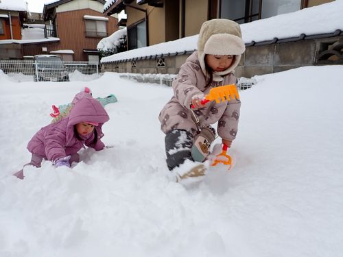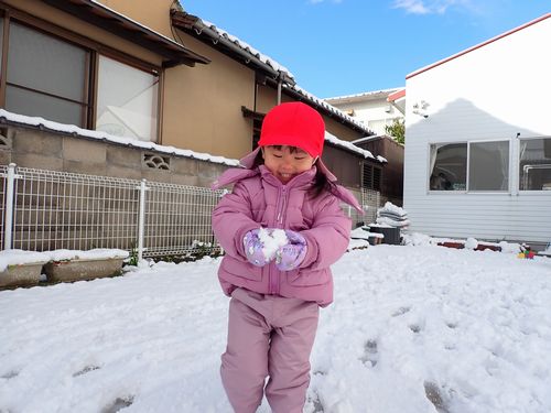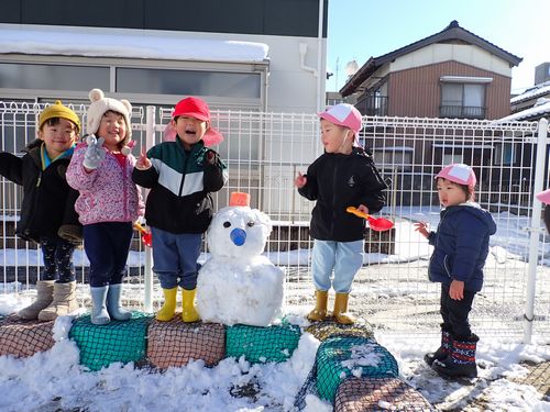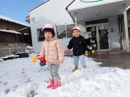 降り積もった園庭の雪を見て、子どもたちは「きょう、ゆきであそぶ?」とわくわくしていました♪