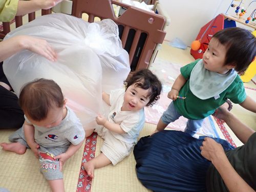 ナイロン袋に空気を入れて大きな風船で遊んだり、