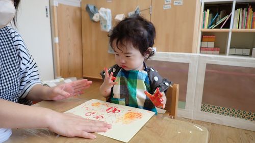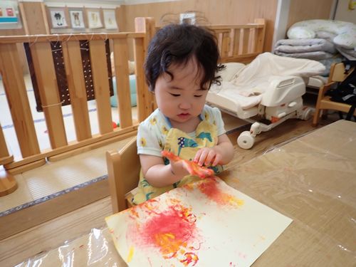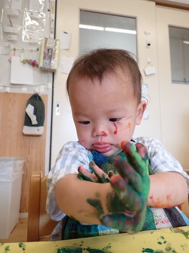 絵の具が手や指に付くと”何かな?”とじっくり見て、触って確かめてしましたよ。