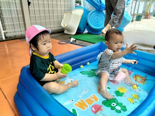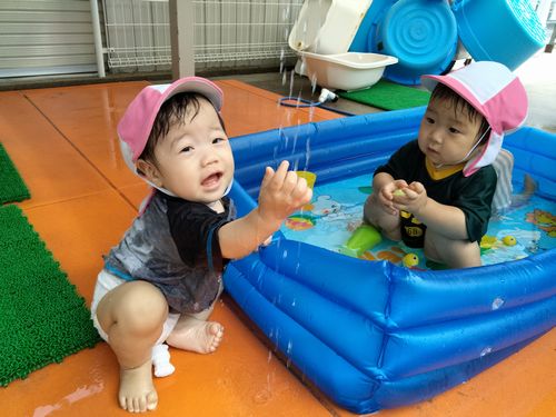 水(温水)に入ると、水を叩いてパシャパシャとしたり、カップに水を入れたり、
