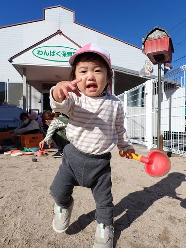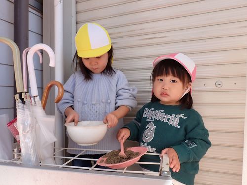 スコップで掘って入れ物に入れたりして砂遊びを楽しんでいます。