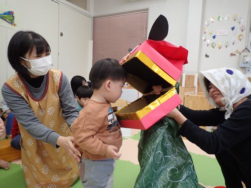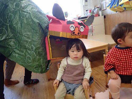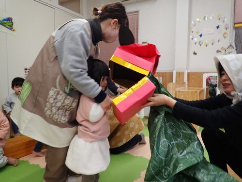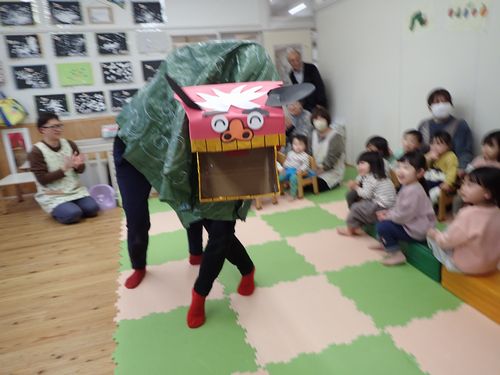 (りす)獅子舞が来てくれました 2025年1月9日 おしらせ あけましておめでとうございます。 本年もどうぞよろしくおねがいします。 元気な子どもたちの声と共に新年がスタートしました。 りすぐみにも獅子舞が来てくれましたよ。 お正月あそびの羽根つきにも挑戦! 子どもたちが今年1年元気で過ごせますように。