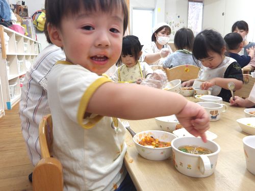 大きなハンバーグをお口いっぱいに頬張ったりと、楽しい給食の時間になりました♪