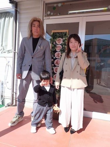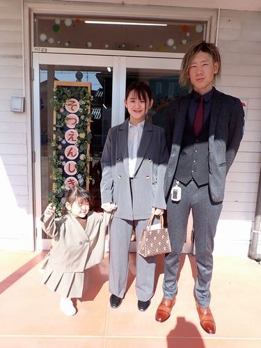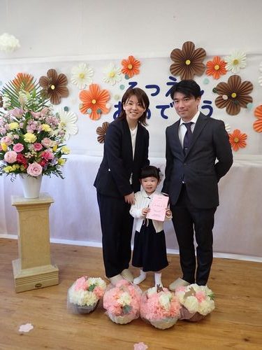 式が終わり、ほっとした様子でおうちの人やお友だち、先生と記念写真をパチリ。