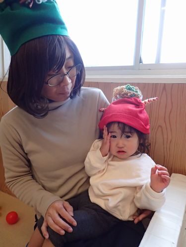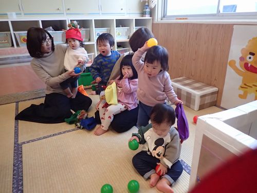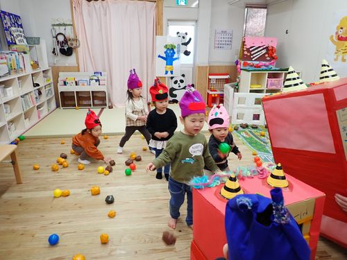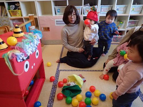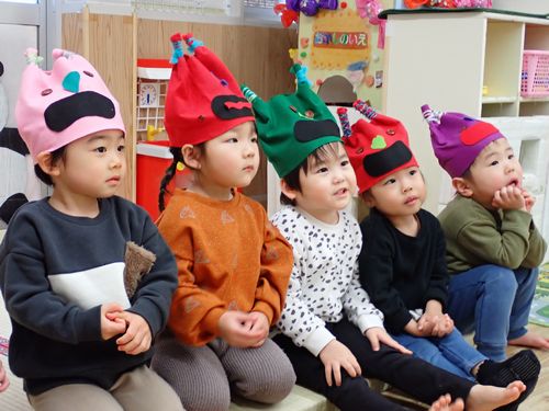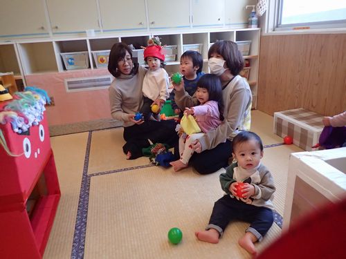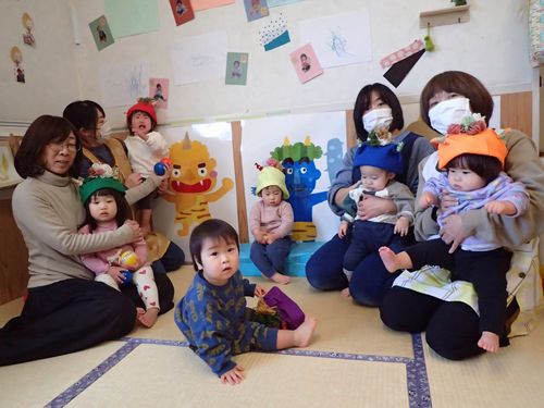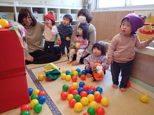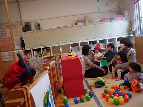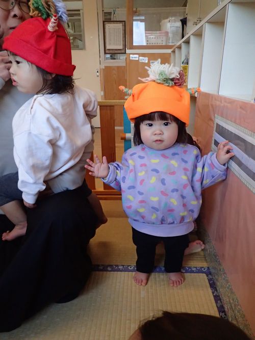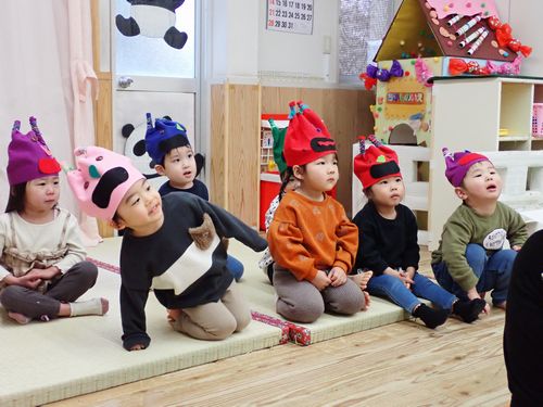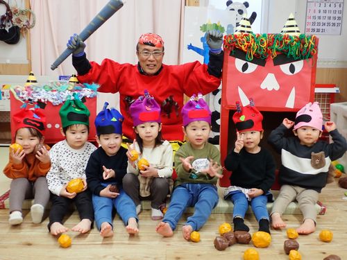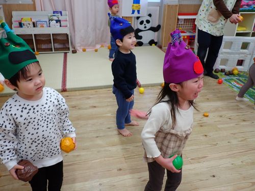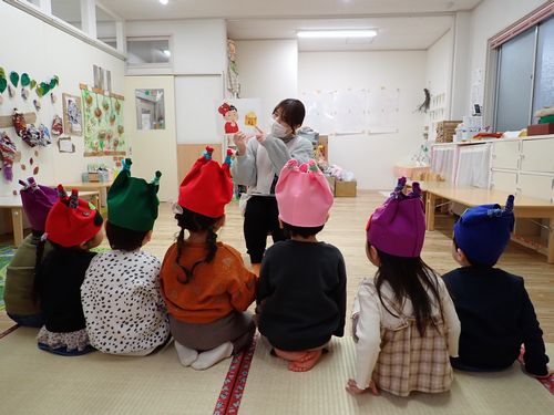 りす組さん、うさぎ組さんは “節分ってなぁに” “どうして鬼に豆をまくの?” など節分のお話を聞きました。