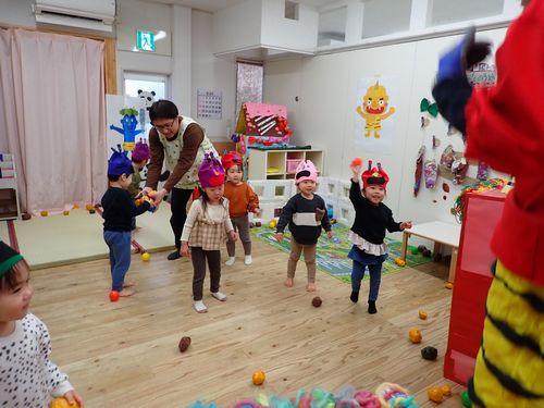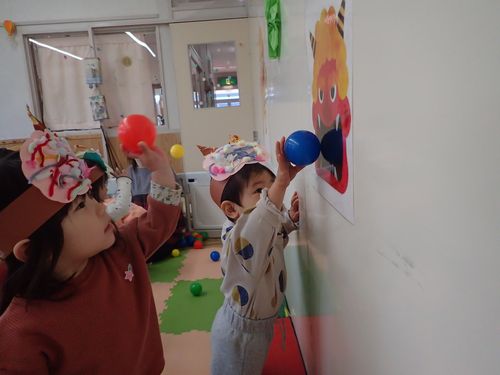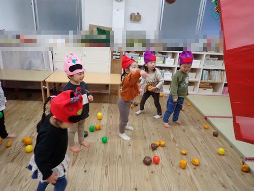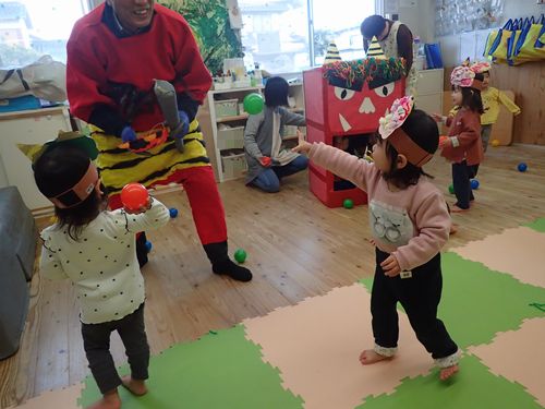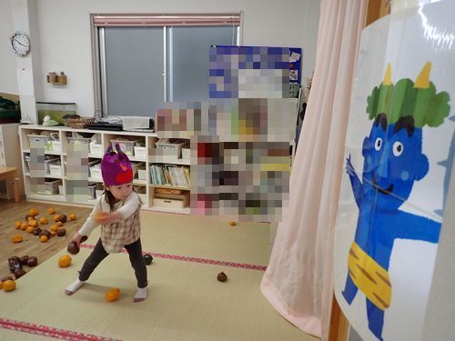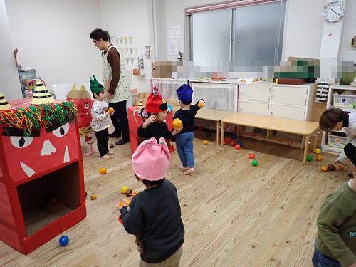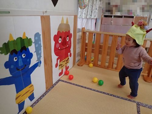 段ボール鬼や壁に貼っている鬼に向かって「おにはそとー!」