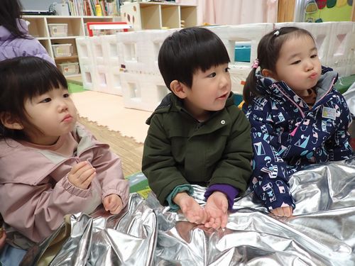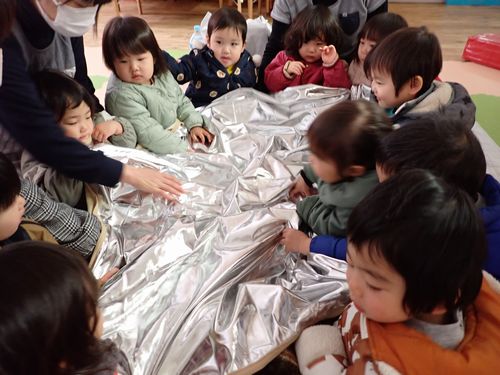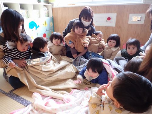 ジャンパーを着て、みんなで集まって毛布の中に座って暖かくして待ちます。