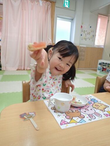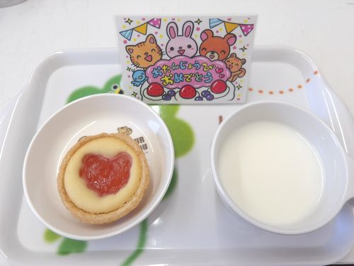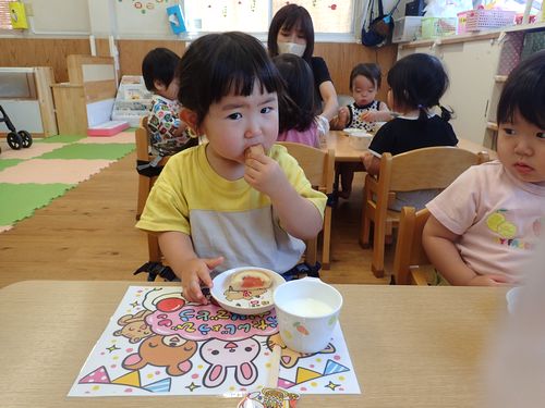 誕生月のお友達は、午後のおやつを「おたんじょうびおめでとうランチョンマット」と「お祝いピック」でいただきます♪
