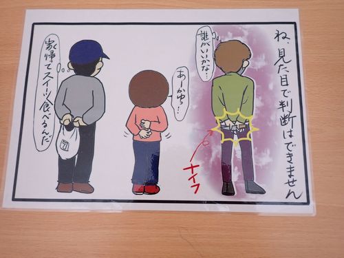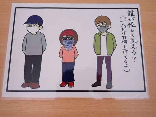 避難後にみんなで集まり振り返りをしながら話をし、誰が怪しい人に見えるかクイズをしてみました。